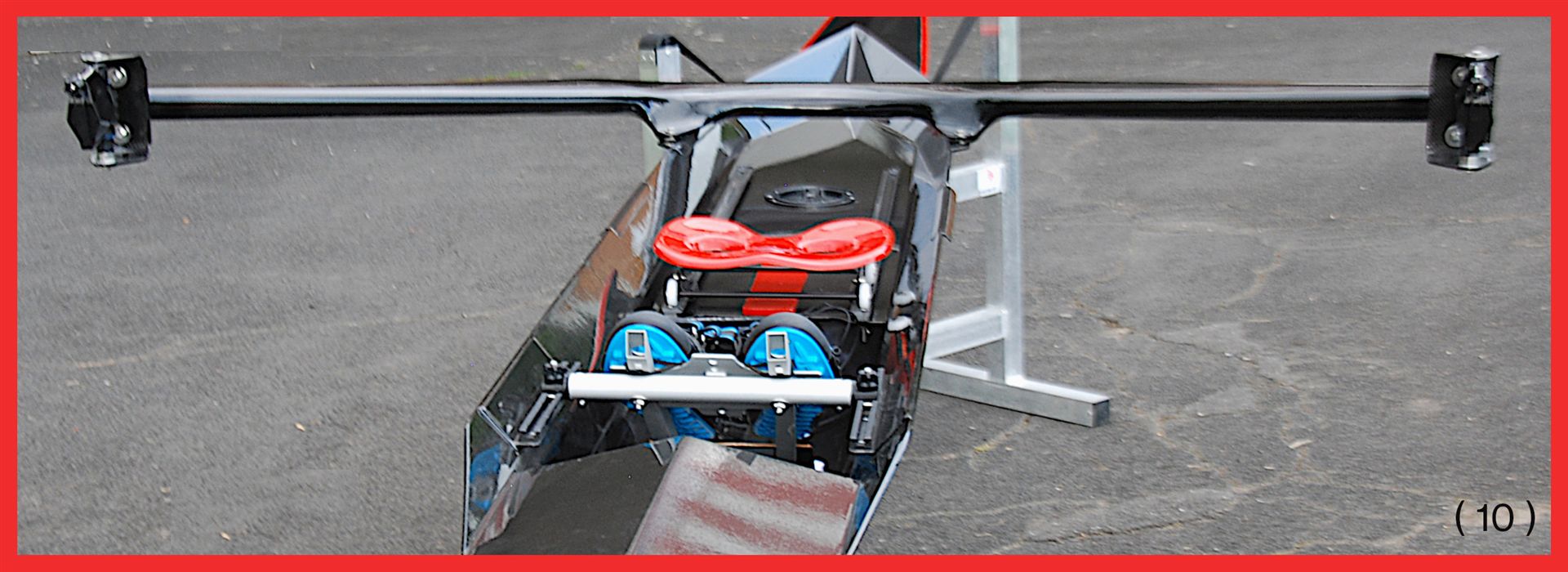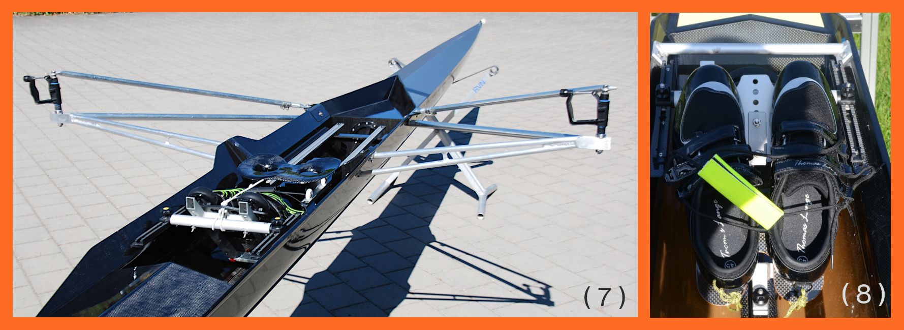 Rechts: Umbau des Stemmbrettes eines älteren Empacher-Einers auf von-oben-Bedienung mit der Hand auch während des Ruderns. Boot Münchener RC.