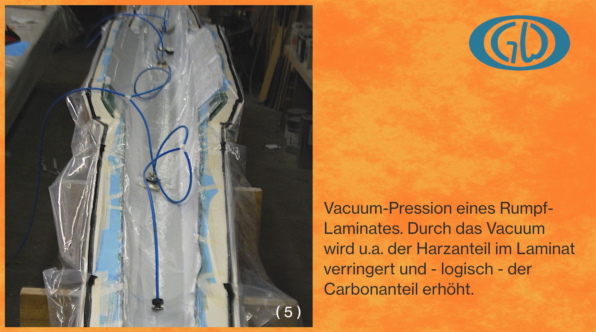 Rumpf und Decks fertige ich als Faserverbundformteile als Carbon- und Epoxidharz-Laminate. Carbon (in der Form von Geweben, Gelegen oder Rovings) ist DER Stoff für Hochleistungssportgeräte, die billige und wenig leistungsfähige Glasfaser verwende ich fast nicht. Der Rumpf ist in mehreren Schichten massiv laminiert und teilweise im Vacuum-Pressions-Verfahren hergestellt. Die Decks sind eine Carbon-Nomexwaben-Sandwich-Konstruktion. Der große Vorteil eines massiven Rumpf-Laminates besteht in der hohen Widerstandsfähigkeit gegen Schäden (Dollenstifte oder sonstiger Unbill). Bei Unbill gibt es meist Kratzer, aber keine Löcher.